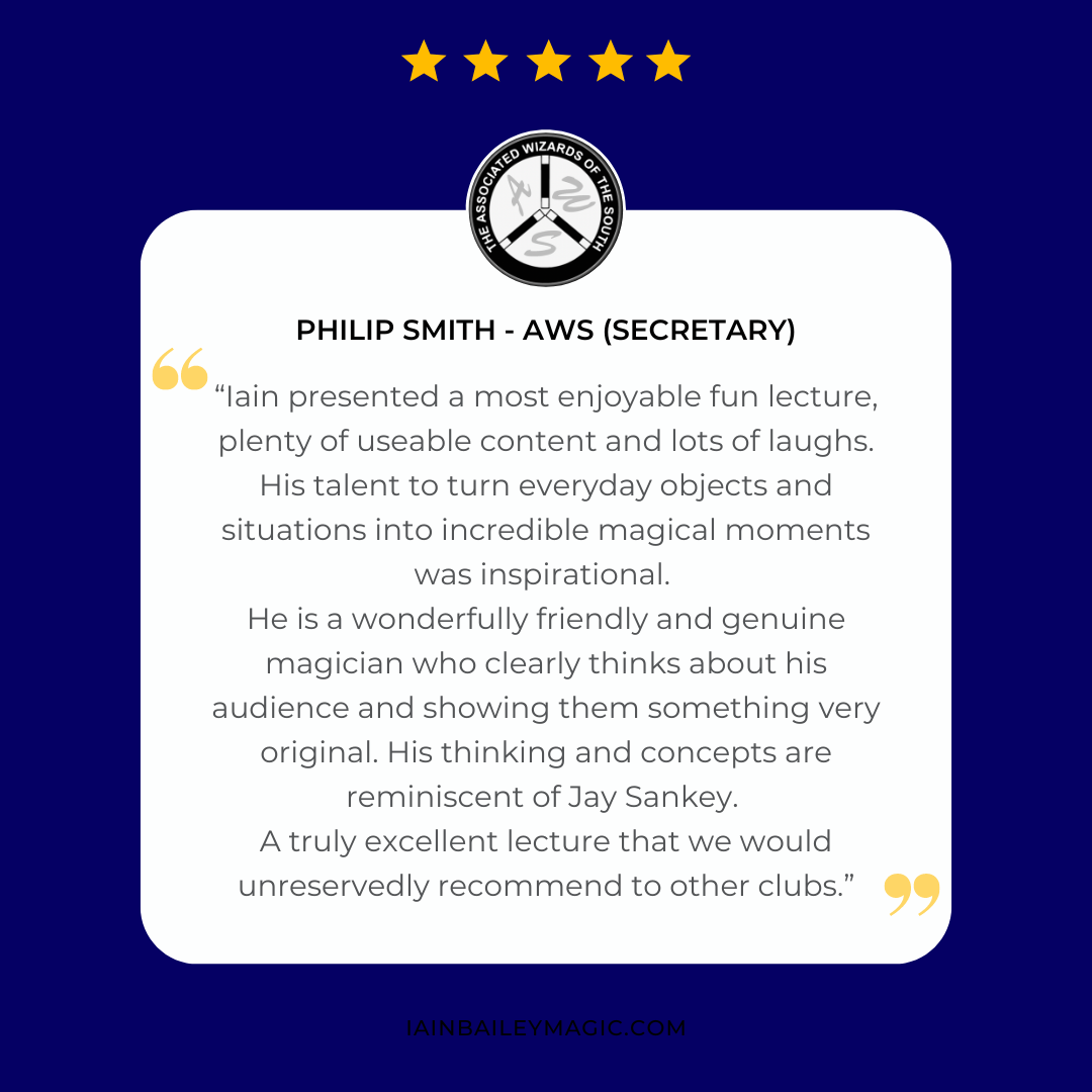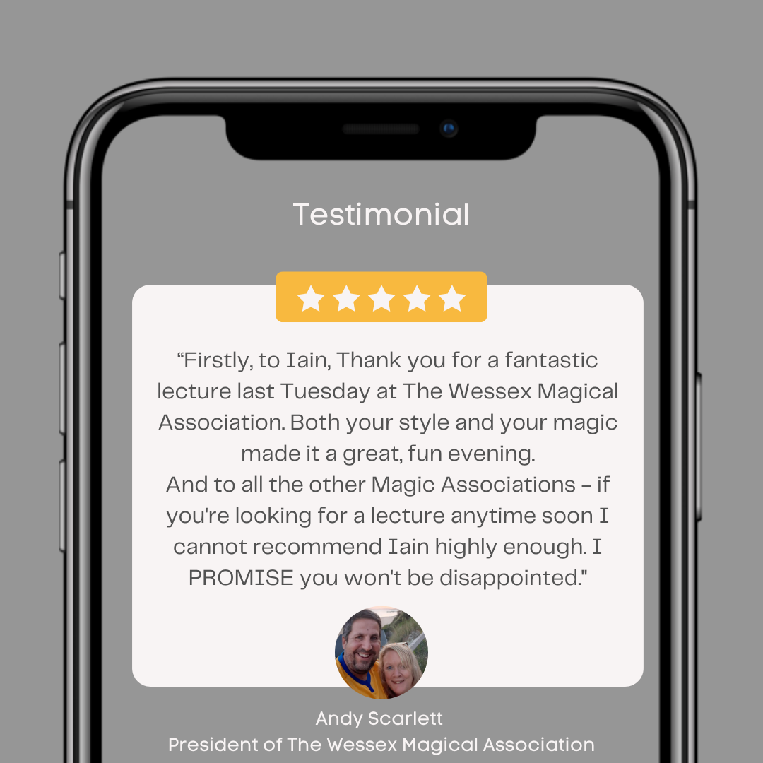 Having already lectured at many magic clubs across the U.K, Iain is beginning to make a strong impression. Book Iain now and your club will thank you for arranging an incredibly fun evening.!